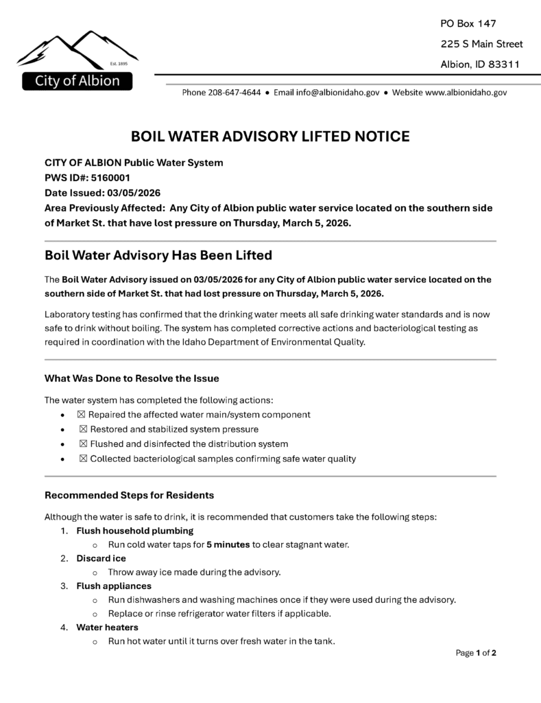 The Boil Order Advisory For City Services South of Market Street has been Lifted. With this, all boil order advisories on the City of Albion public water system are lifted. Click Here or on the Image to View the Full Notice