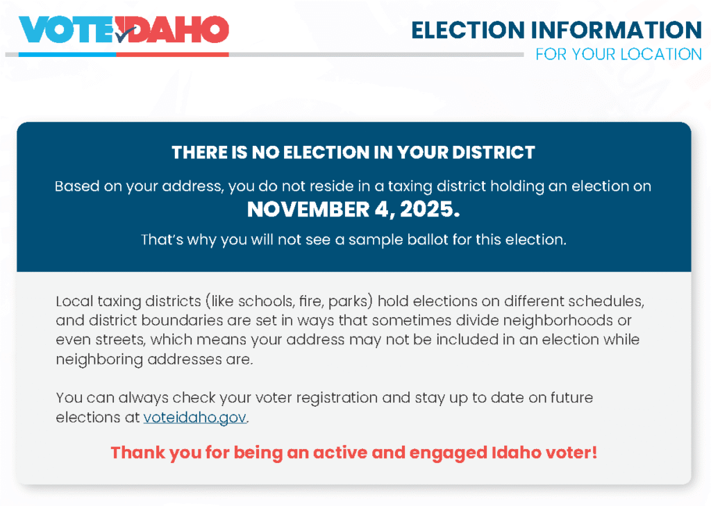 Notice- There are no active elections in the Albion area. No election will be held 11/4/25. Check out Idaho’s one-stop website for all your voting resources- voteidaho.gov