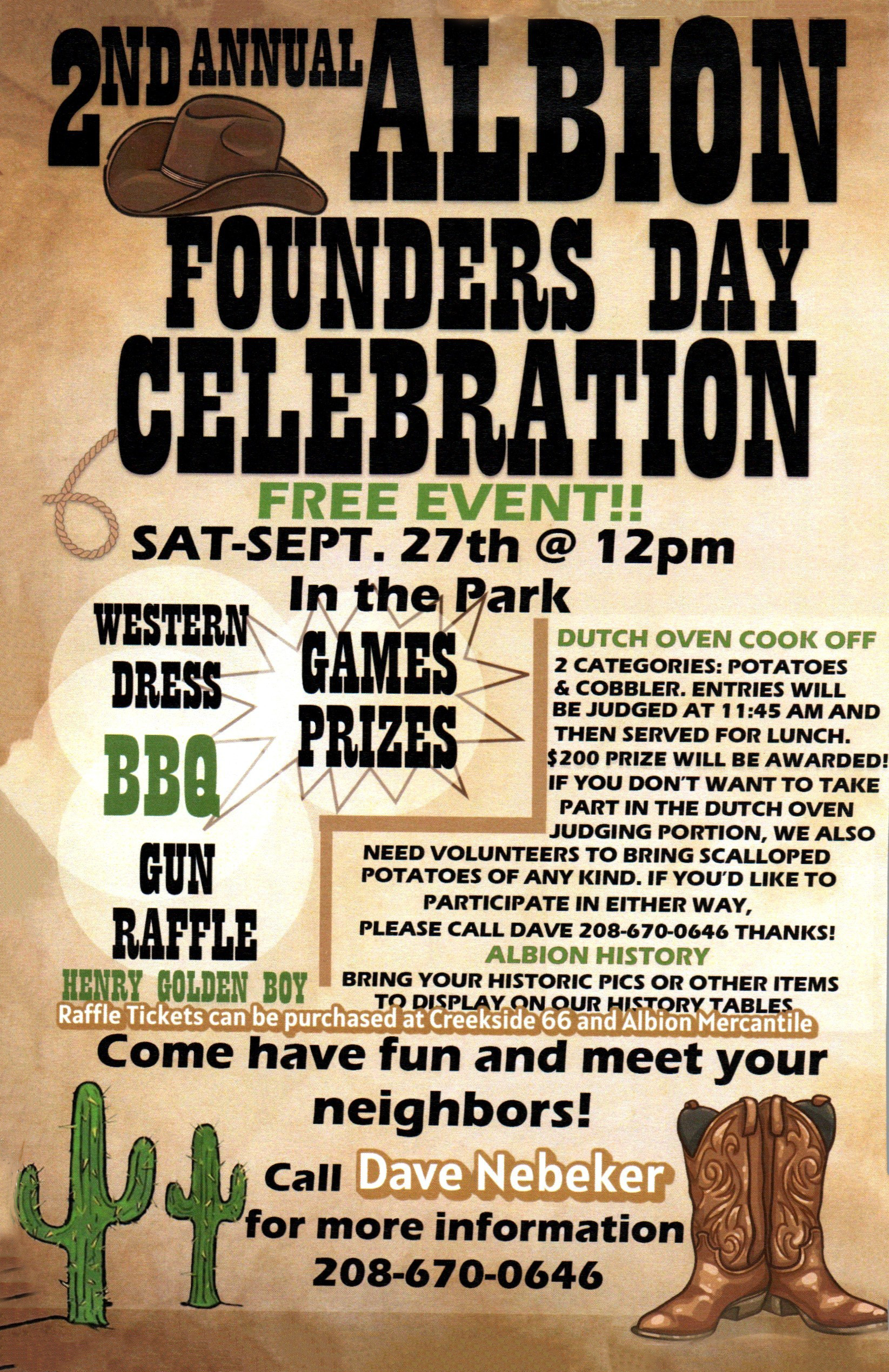 Albion Founder's Day Celebration on Saturday, September 27th, 2025 at the Albion City Park. Fun begins at noon and includes BBQ meal with dutch oven potatoes and deserts. Prizes for the best dutch oven potato and best dutch oven desert.